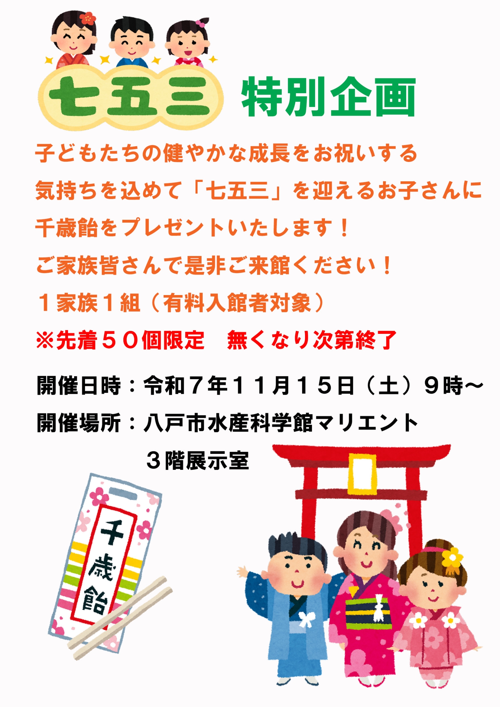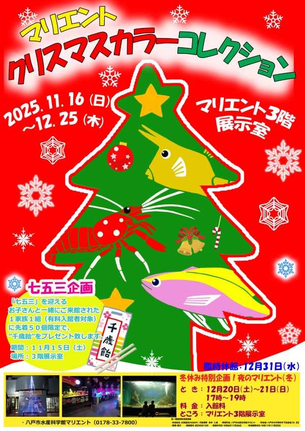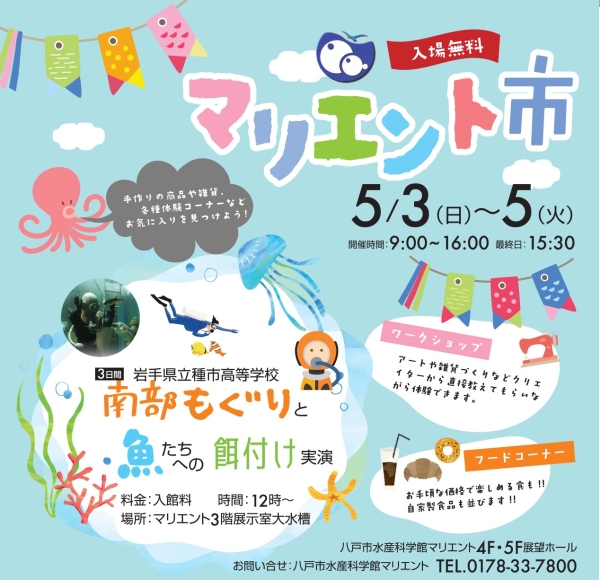 八戸近海魚の大水槽、ウミネコシアターの上映や、イカの不思議とタッチ水槽、展望室・ちきゅう情報館があり、八戸の海の歴史にふれられます。