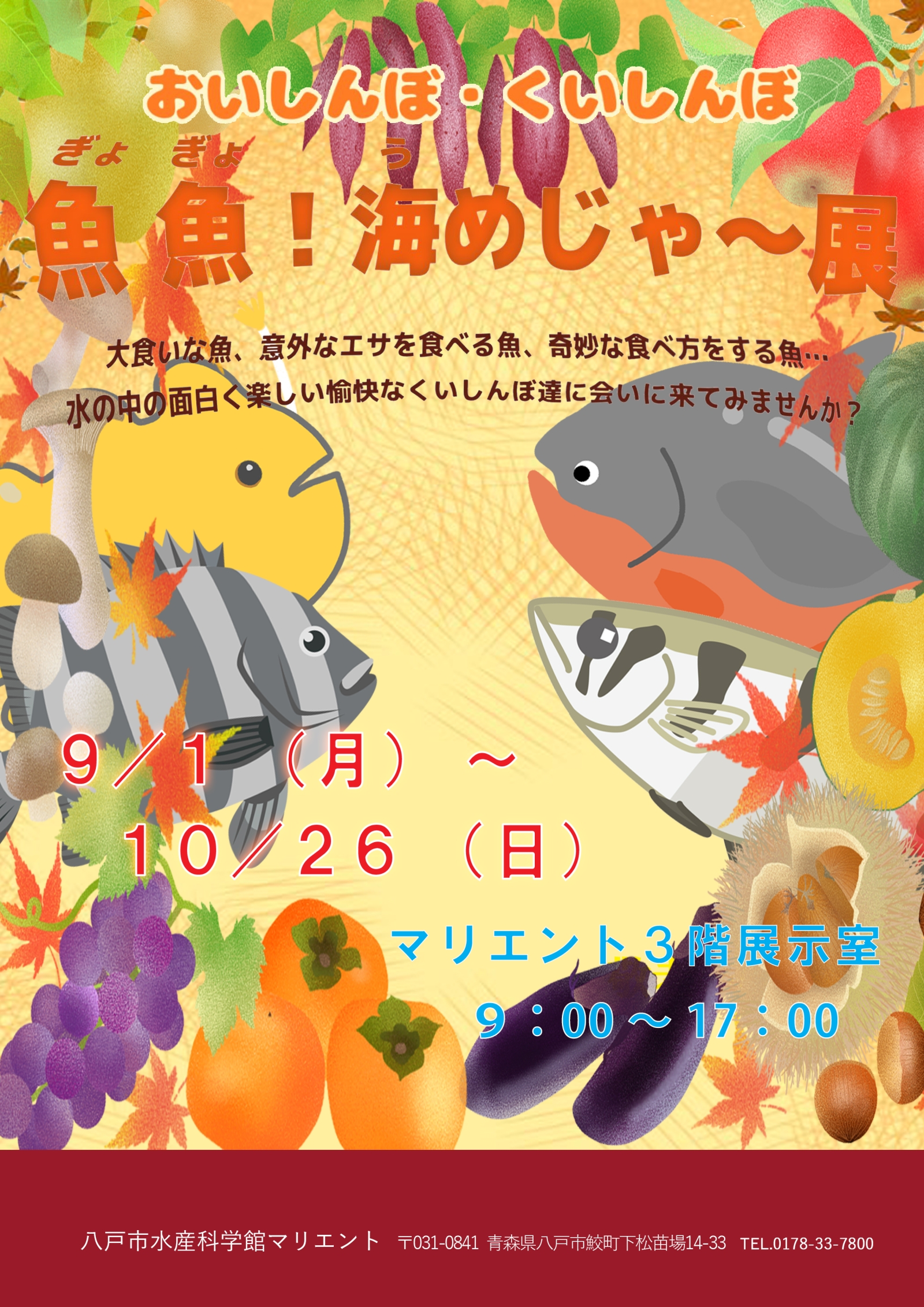 マリエントでは下記の通り、秋の日企画展「おいしんぼ・くいしんぼ 魚魚(ぎょぎょ)!海(う)めじゃ~展」を開催致します。